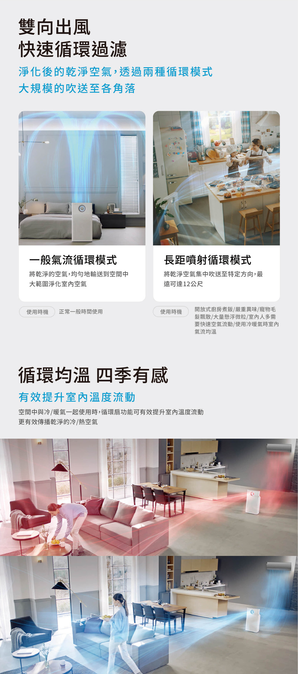 四重氣流模式:長距噴射氣流、快速循環潔淨