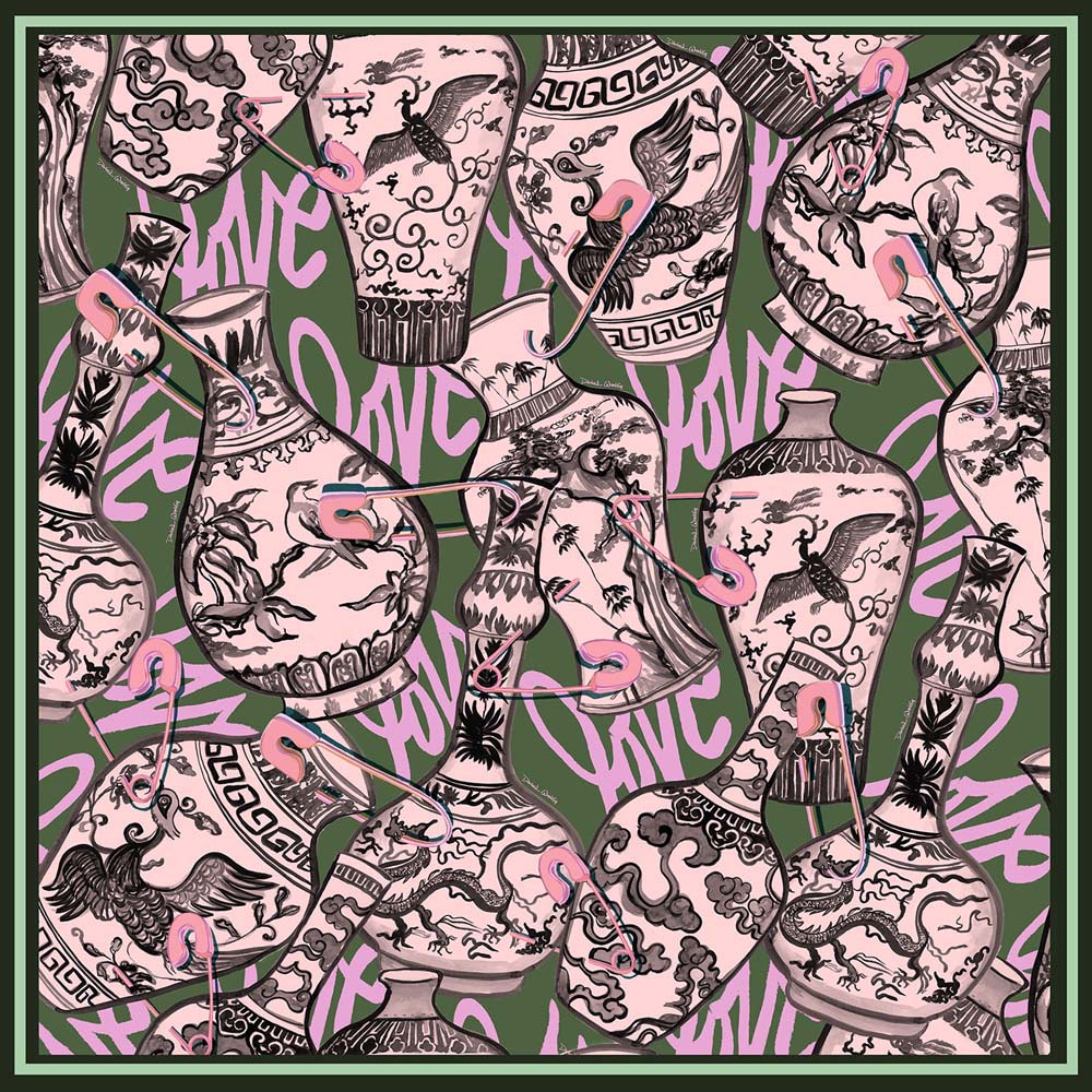 Hermes 愛馬仕 Acte III, Scene I, La Clairiere Decoupage 70 cm手工捲邊斜紋真絲方巾(綠/黃/玫瑰)