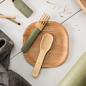 結構設計上,不拼接竹材,由竹管一體成形出湯匙與叉子,保留原有的紋路與竹節,