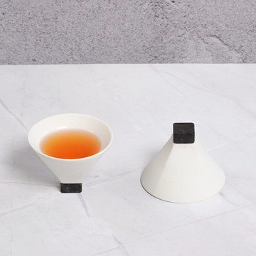 將玉鐲製作過程中所切下的小塊玉石,透過異質拼接手法,打造瓷杯優雅如花的器型。