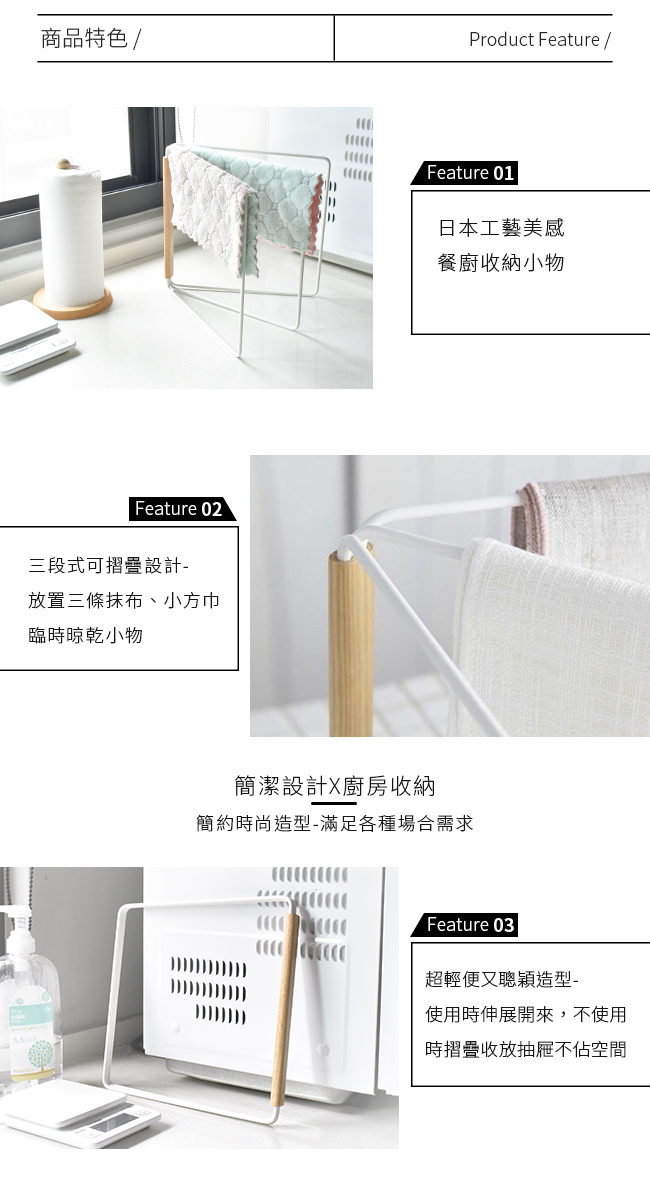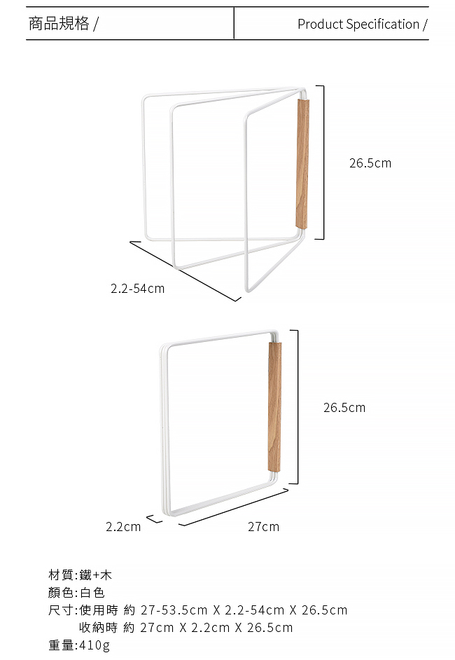 規格■材質:鐵+木■顏色:白色■尺寸:使用時 約 27-53.5cmX2.2-54cmX26.5cm收納時 約27cmX2.2cmX26.5cm■重量:410g
