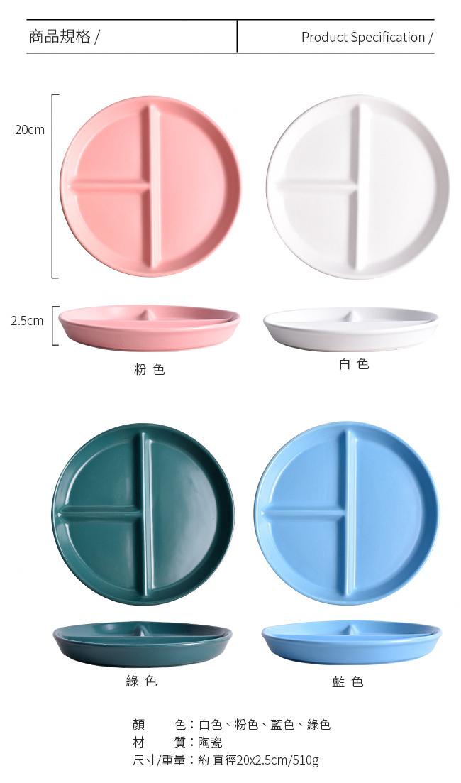規格■顏色:白色、粉色、藍色、綠色■材質:陶瓷■尺寸/重量: 約 直徑20x2.5cm/510g