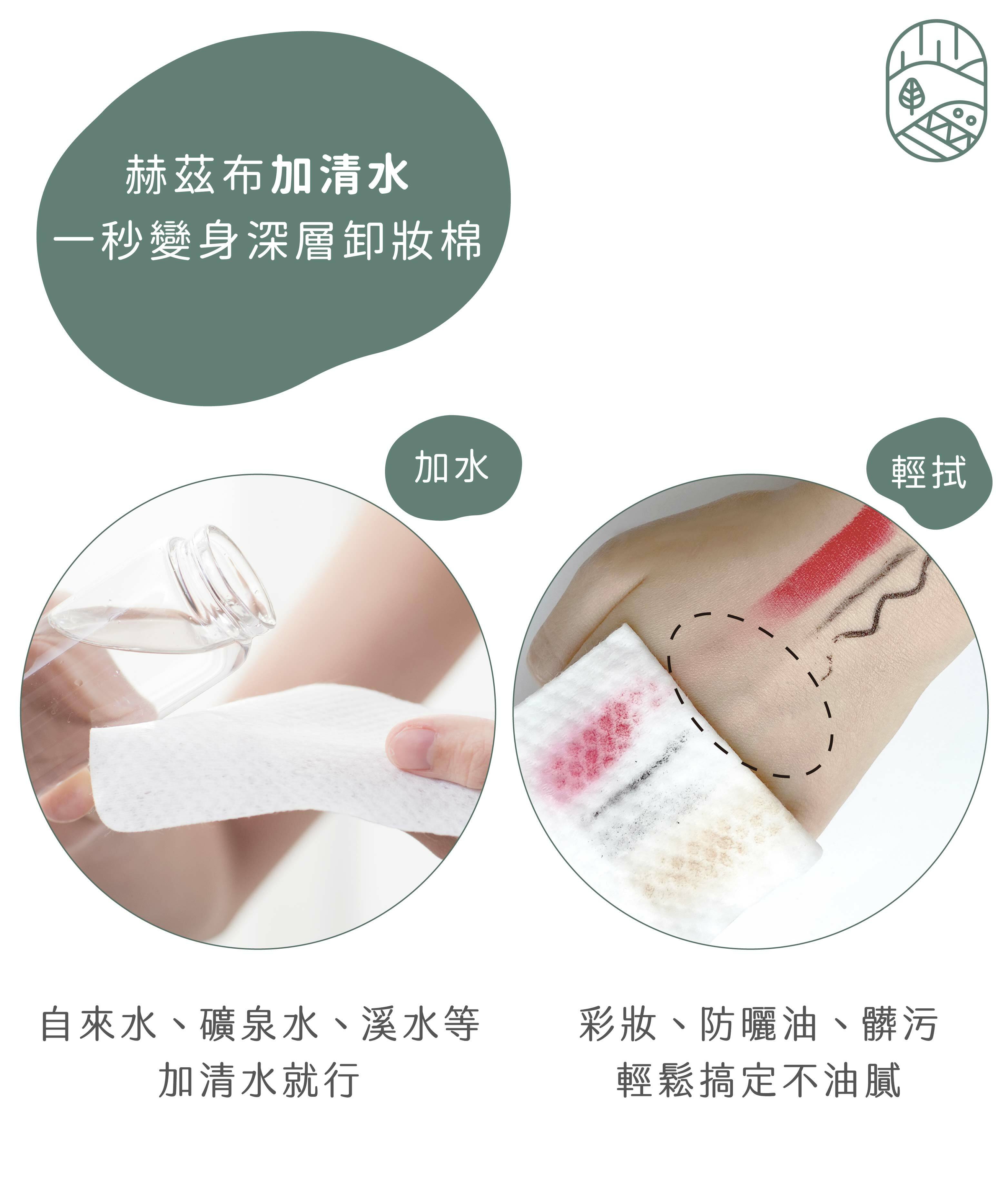 加水就能卸妝,不需要再將卸妝油或卸妝水倒在赫茲布上~