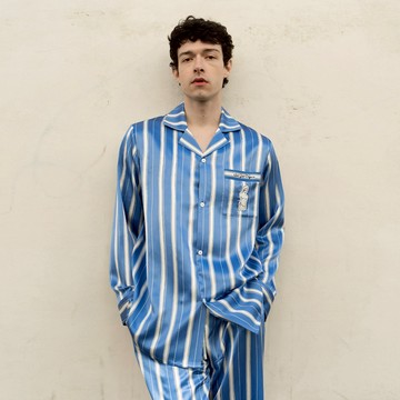 NotJustPajama心動博物館系列 男士條紋真絲長袖長褲睡衣套裝 - 藍色條紋-M