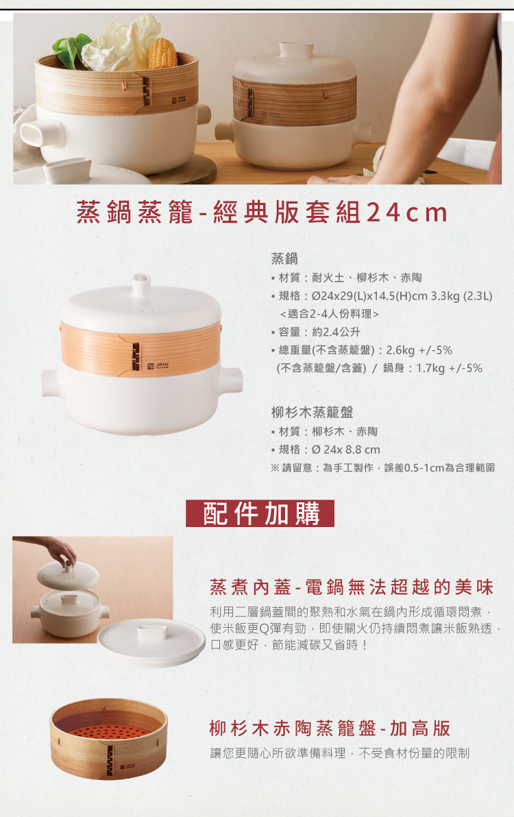 • 使用蒸籠時,建議將食物放在盤上或墊一層烘焙紙,以避免食物直接沾黏於赤陶上而留下殘漬。