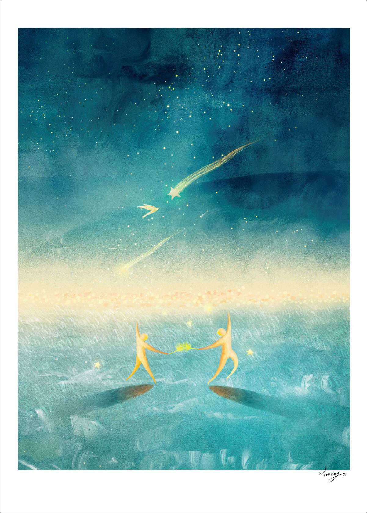 創作靈感多來自音樂、文學和攝影,還有各種想像。希望透過柔軟細膩的筆觸畫出自由與寧靜舒服的感覺,描繪充滿想像和感知的獨特世界,帶觀者到達更遠的地方。