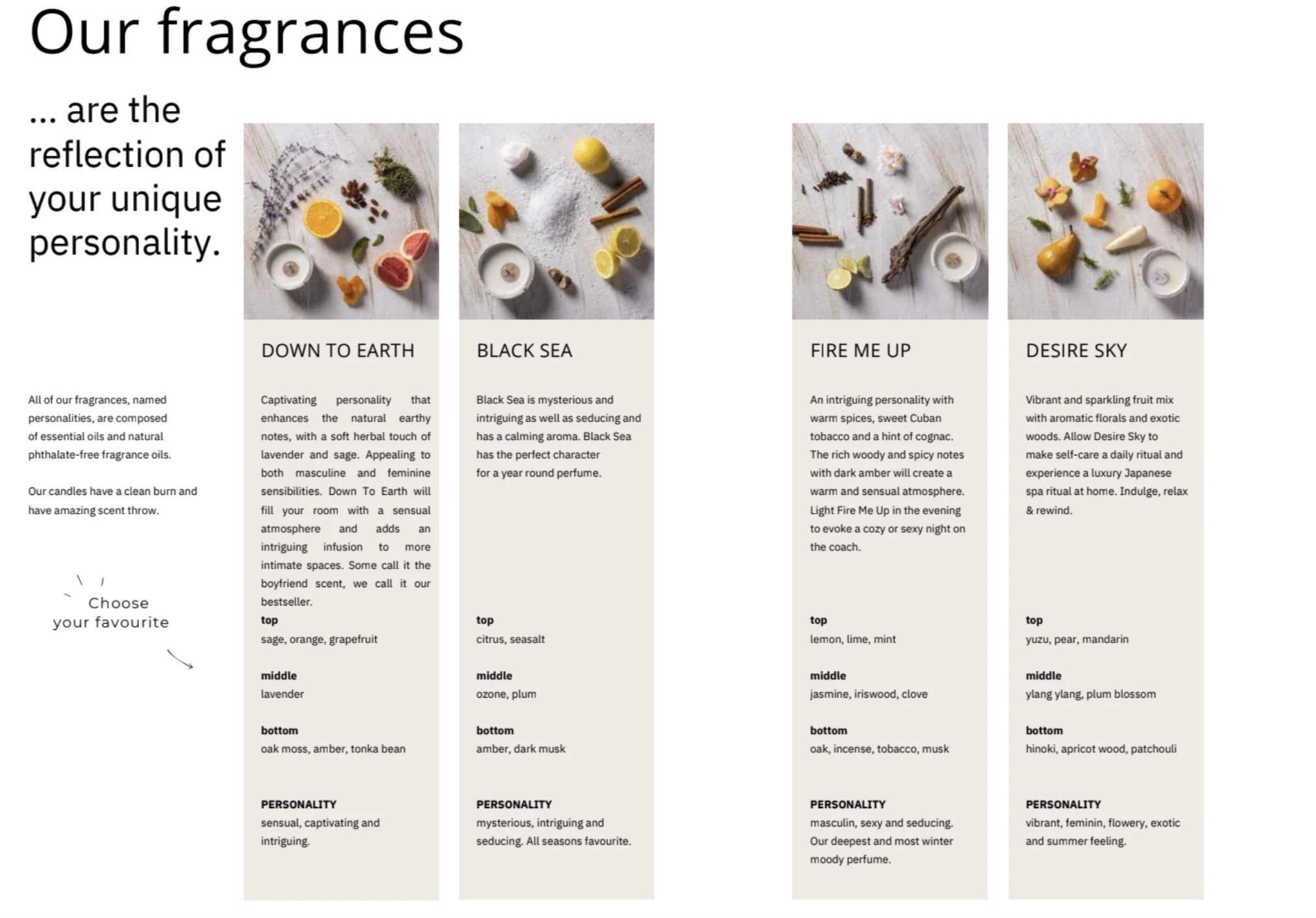 DOWN TO EARTH : 突顯自然土質的香氣,並帶有柔和的薰衣草和鼠尾草草本香。有些人稱之為「男友香」,我們則稱它為最暢銷的香氣。這款香氛擁有層次豐富的香氣,從清新且草本的前調,到溫暖而令人陶醉的底調,完美地融合了大自然的元素,創造出令人著迷的氛圍。