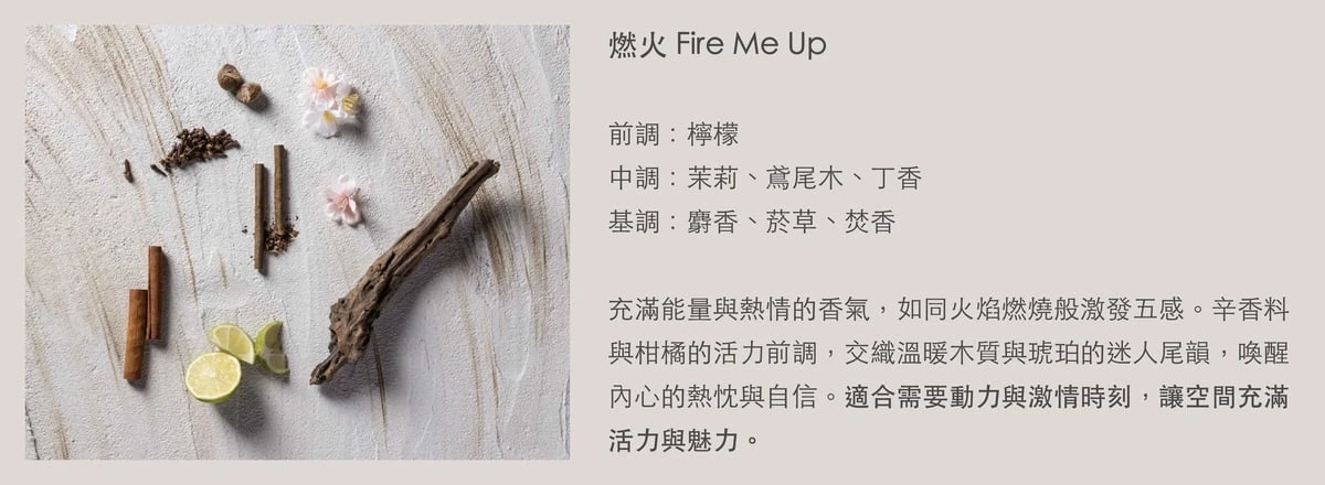 FIRE ME UP:這款香氛融合了溫暖的香料、甜美的古巴煙草和一絲淡淡白蘭地香。濃郁的木質與辛香調,再加上深沉的琥珀,營造出溫暖且感性的氛圍,是最具冬日氛圍的香氣。