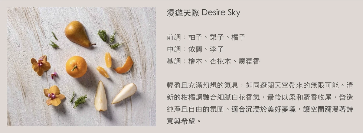 DESIRE SKY:水果混合香氣,搭配芳香的花卉和異國情調的木質香調,彷彿帶來日本的水療體驗,讓您在家也能享受放鬆的時光。放鬆身心,重拾活力,帶有夏日無限生機的氛圍。