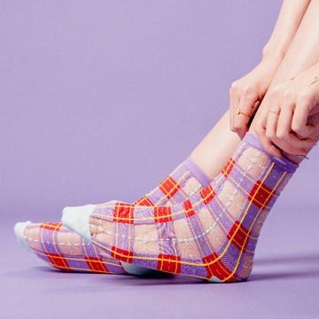 與台灣半甲經驗的傳統織襪廠商溝通製作,設計-產出長達兩年,對品質與設計的要求反覆修改,考慮不同腳型和舒適度的需求,材質使用手感柔軟的細單絲尼龍,「顏色交錯、手工修線」從腳尖腳跟每一個小細節都不妥協,希望提供品質好、獨創性高的 sheer socks 透紗襪。