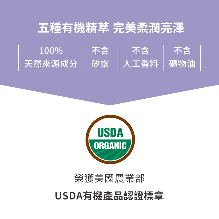 全成分及產品皆通過美國農業部USDA有機認證,純粹天然成分,不含水、酒精、矽靈、化學成分或人工添加物,成分單純連孕婦都能安心使用! 100%純植物原料,不含任何動物原料,純素者也能安心購買。