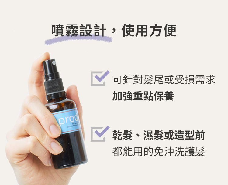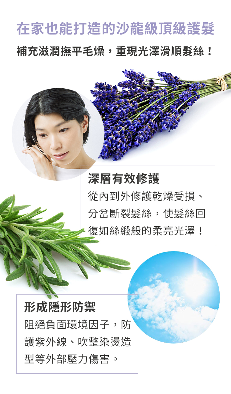輕盈舒適的免沖洗質地,不論乾髮濕髮,或是洗髮後或造型前都能使用,只要輕輕一噴再吹乾,輕鬆擁有天使光圈好髮質,保持閃耀亮澤,柔順不糾結,更容易梳理和造型。舒緩心情的薰衣草精油香氣,帶來愉悅又療癒的保養時光。特別推薦給不想花時間護髮、或希望即時撫平毛躁的人使用。