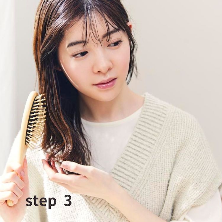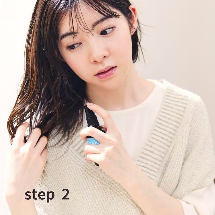 STEP1:洗髮後用毛巾稍微擦乾,從離頭髮約20公分處,以髮根為中心適量噴灑本產品,然後邊梳髮邊均勻讓頭髮全體吸收。
