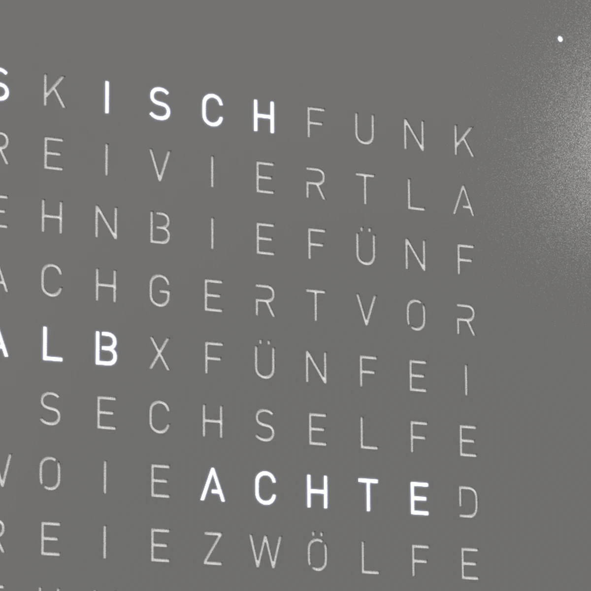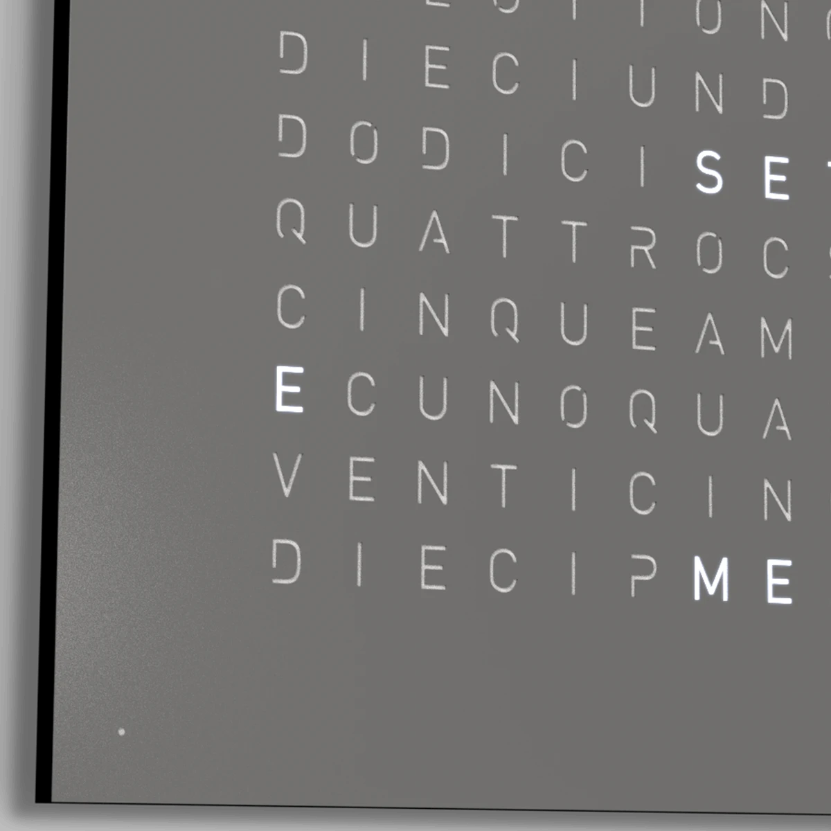 在秒數模式下,QLOCKTWO 會在其矩陣顯示區域內(主畫面)以大數字顯示秒數。而原本四個角落的小圓點(用來指示分鐘)仍然會保持可見,不會因為秒數顯示而消失,以確保時間顯示的完整性。