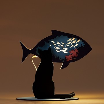 SETO CRAFT 3D 木製 DIY 貓形氛圍小夜燈 - 貓與魚