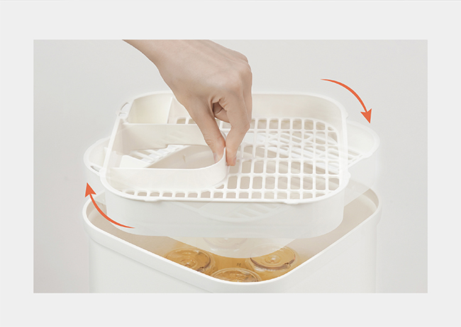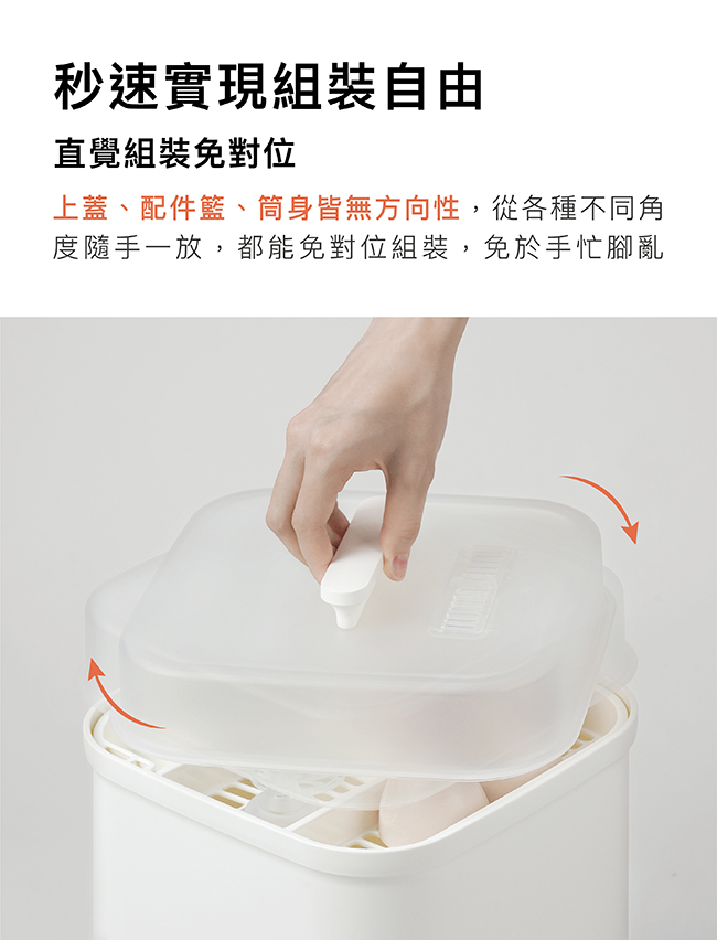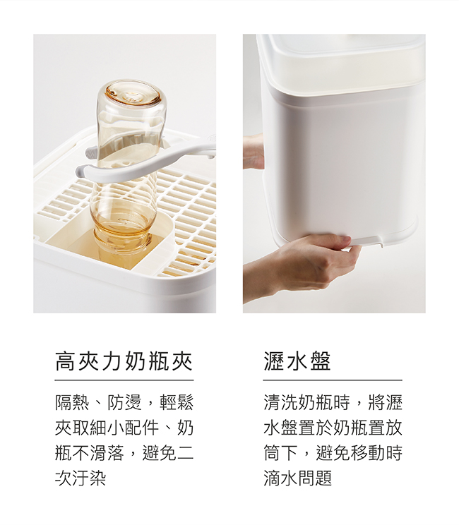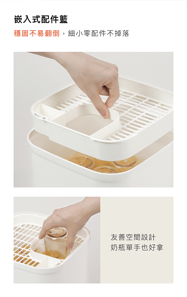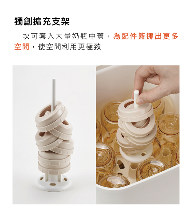 •將奶瓶奶嘴、配件分別置於奶瓶置放筒及配件籃。