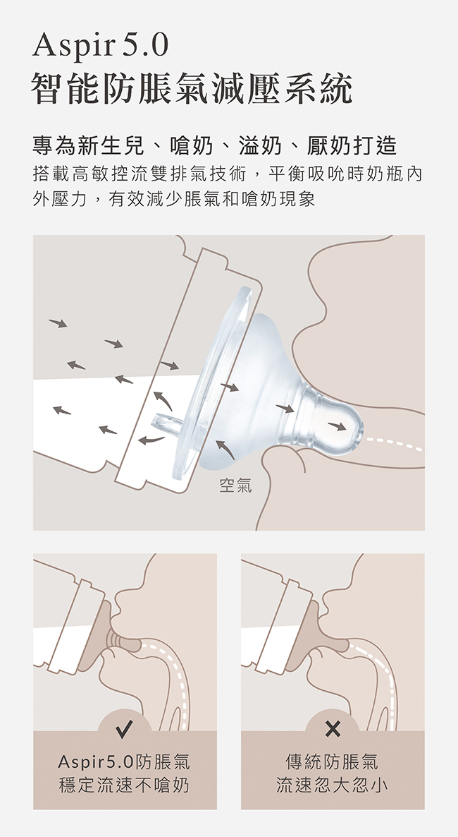 2.Aspir 5.0智能防脹氣減壓系統,防嗆奶、防溢奶、防脹氣。