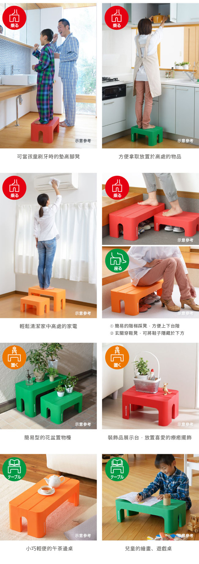 可當階梯輔助用踩凳、浴室坐凳、幼童洗手墊高凳、兒童馬桶墊腳踩凳、客廳椅凳、兒童遊戲桌、午茶邊桌、穿鞋凳、置物台等...。( 下方圖文的商品顏色為示意參考,粉彩款為同品牌 Decora step椅凳系列 )