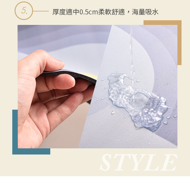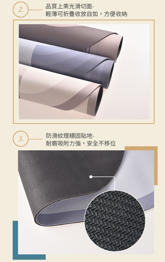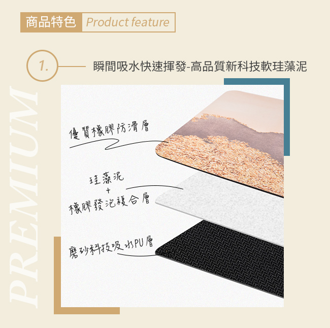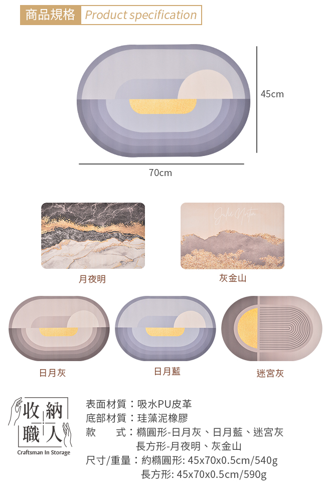 規格■表面材質:吸水PU皮革■底部材質:珪藻泥橡膠■款式:橢圓形-日月灰、日月藍、迷宮灰長方形-月夜明、灰金山■尺寸/重量: 約橢圓形: 45x70x0.5cm/540g長方形: 45x70x0.5cm/590g