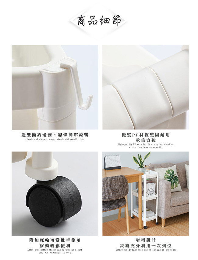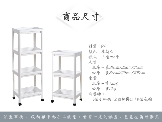 規格■材質:PP■顏色: 清新白■款式:三層/四層■尺寸: 約三層 長36cmX23cmX70cm四層 長36cmX23cmX105cm■重量: 約三層 重1.6kg四層 重2kg■內容物:2個小掛鈎+2個粗掛鈎+4個底輪
