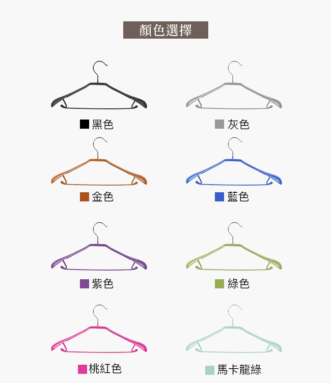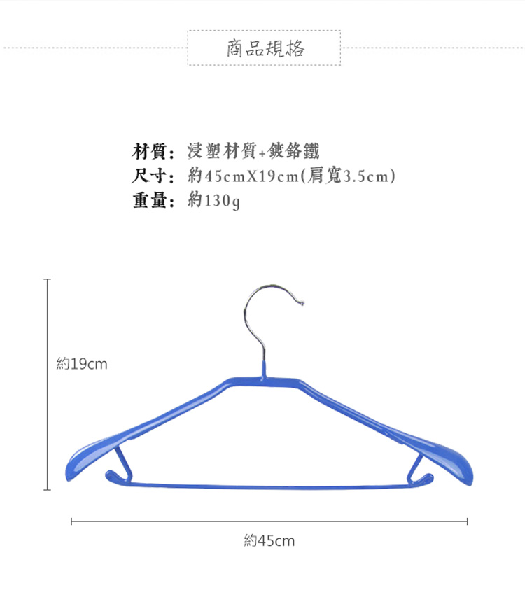 規格■顏色:黑色/灰色/金色/藍色/紫色/綠色/桃紅色/馬卡龍綠/米白色■材質:浸塑材質+鍍鉻鐵■尺寸: 約45cmX19cm(肩寬3.5cm)■重量: 約130g備註注意事項:■手工測量存在1-2cm誤差,屬於正常現象,請以實物為準。■色差:商品圖片會因拍攝時的光線、角度或觀看者的手機及電腦螢幕不同等客觀因素,而有一定色差,請以實物為準。