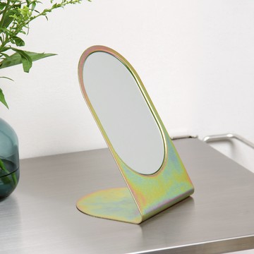 「水水桌鏡」是一款簡約優雅的桌鏡,以山中湖泊鏡影為靈感,使用單一金屬板打造出一體成形的外觀。