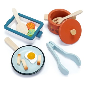 餐具組訓練兒童手眼協調,刺激整體綜合能力發展。在運用廚房功具與食材的遊戲過程中,建構生活常識與能力。透過扮家家酒中的角色扮演,來滿足孩子角色模仿的好奇心。遊戲中融入生活情境,激盪孩子的想像力與應變能力。