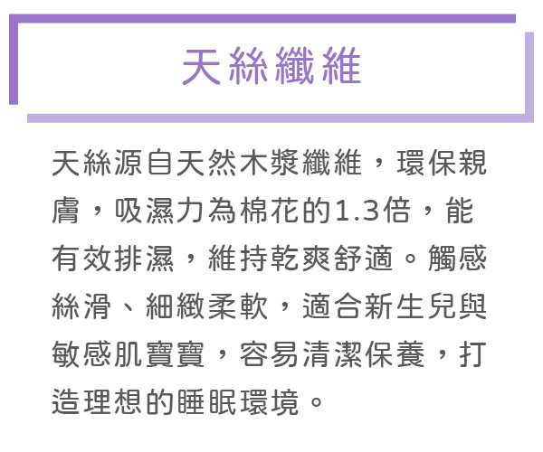 含天絲抗菌纖維、薰衣草及香蜂草精油,冬暖夏涼,清爽透氣又能防潮防滲,溫柔的觸感特別呵護寶寶肌膚。