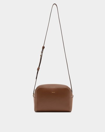 這款 Easy Bally 斜背包以棕色小牛皮製作,前方點綴小型金色箔標誌,是精緻且多功能的配件。