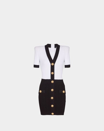 羅紋針織布料製成,結合黑白拼接設計,營造強烈對比視覺效果。短袖與V領剪裁展現俐落線條,前排 BALMAIN 經典金色徽章釦增添華麗質感。緊身版型修飾曲線,短版長度凸顯修長腿部比例,展現現代摩登氣息。
