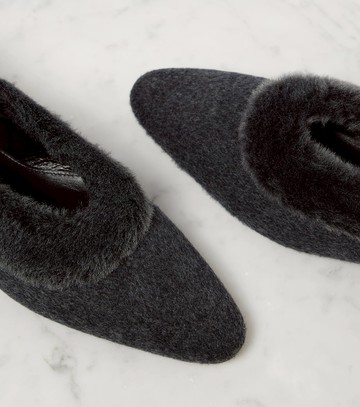 Upper: wool. Lining: leather. Sole: leather insole and sole. Toe shape: almond toe. Made in China. Includes: shoe box, dust bag. Designer color name: Dark Grey Melange. Item color: gray. Trim: shearling.