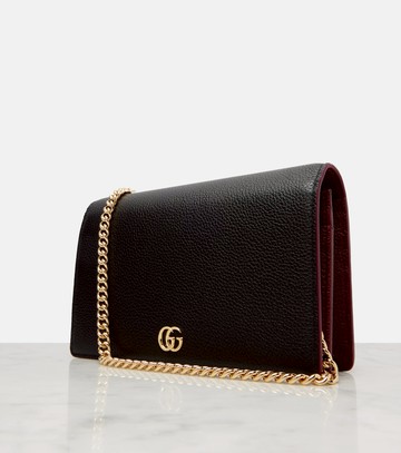 Material: leather. Lining: leather. Made in Italy. Designer color name: Black/Rosso Ancora. Item color: black, red. Closure: snap-buttoned fastening. Internal details: internal zipped pocket, Card slots, internal slot pockets, mirrored interior, single compartment. Hardware color: gold. Detachable chain. Includes: dust bag, box. Leather.