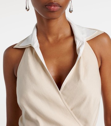 Material: 51% linen, 46% rayon, 3% elastane. Care instructions: machine wash cold. Made in China. Designer color name: Sand Multi. Item color: beige. Material II: 63% cotton, 37% polyester. Lining: 100% cotton. Closure: tie waist. Collar: classic (Straight point). Linen.