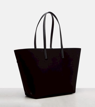 Material: nylon. Lining: suede. Made in Romania. Designer color name: Black. Item color: black. Trim: calf leather. Details: leather. Internal details: single compartment. Top handles. Closure: open top. Detachable zipped pouch. Includes: dust bag.