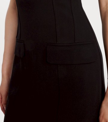 Material: 100% polyester. Care instructions: dry clean. Made in China. Designer color name: Black. Item color: black. Hardware color: silver. Lining: 100% polyester. Closure: zipped back. Built-in bustier. Pockets: flap pockets. Long vent. Fully lined.