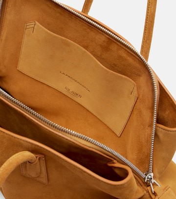 Material: calf leather (suede). Lining: suede. Made in Italy. Designer color name: Mustard. Item color: brown. Trim: calf leather (suede). Leather. Hardware color: silver. Top handles. Internal details: two internal compartments, centre slot compartment. Closure: open top, two-way zipped top. Protective feet. Includes: dust bag.