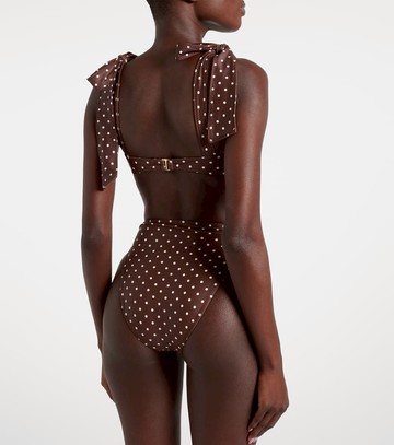 Material: 80% polyester, 20% elastane. Care instructions: hand wash. Made in the USA. Designer color name: Brown Polka Dot. Item color: brown, white. Hardware color: gold. Closure: self-ties, hook-fastening back. Underwired cups.