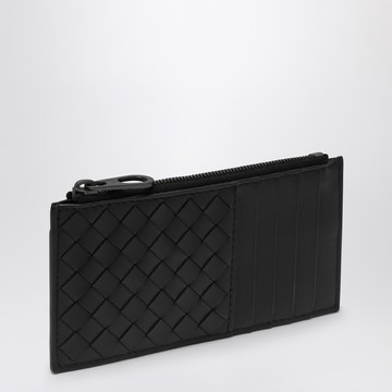 Card case in black leather with Intrecciato pattern by Bottega Veneta, featuring a zipped pocket and several card slots.