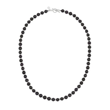 #SterlingSilver Thread by hand in our London studio, this pearl necklace will slip seamlessly into your collection of style staples. A modern mix of black freshwater pearls and shiny sterling silver beads, wear on it's own or layer with other pieces. Complete with our signature sterling silver hammered circle and t-bar catch. Pearl size - approx. 6mm. Length 20 inches