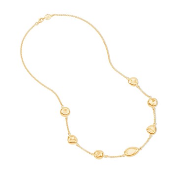 #SterlingSilver Combining natural forms with modern design, this handcrafted sterling silver chain necklace has seven organically-shaped pebble pods, each with a subtle dimple. The necklace is complete with our signature lobster catch. Wear alone or pair with another necklace or pendant for a layered look. Pebble sizes - approx. 10-20mm. #YellowGoldVermeil Combining natural forms with modern design, this handcrafted sterling silver chain necklace has seven organically-shaped pebble pods, each with a subtle dimple. The necklace is complete with our signature lobster catch and has a radiant yellow gold vermeil finish. Wear alone or pair with another necklace or pendant for a layered look. Pebble sizes - approx. 10-20mm.