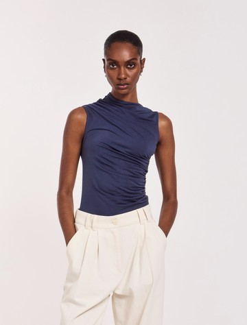 Sleek, sculptural, and effortlessly refined, this sleeveless high-neck top is designed with our signature draping for a flattering, form-fitting silhouette. Crafted from sustainable MicroModal, it offers a soft, breathable feel with a touch of stretch for all-day comfort. Perfect for elevating the everyday, it's a versatile staple that pairs seamlessly with denim or tailored separates.