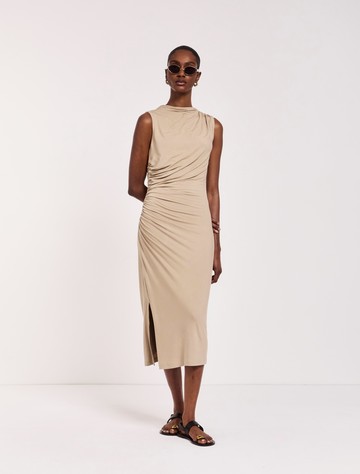 Elegant and understated, this gathered midi dress is designed with fluidity and ease at its core. The sleeveless silhouette features a high neckline and gentle draping across the body, creating soft ruching that flatters every movement. A discreet side slit adds both function and flow, while the silky, MicroModal jersey fabric hugs the body with comfort and lightness. Perfect for day-to-night dressing, it offers a refined take on effortless summer dressing.