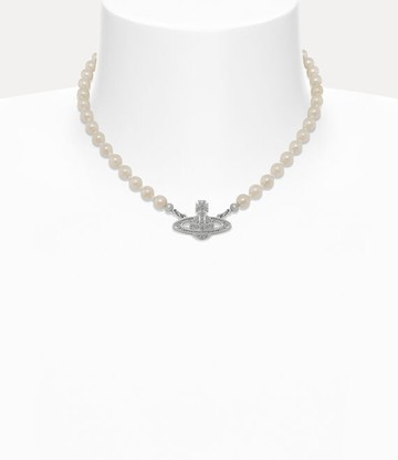 In the late 1980s, Vivienne Westwood introduced her iconic pearl concept at the Harris Tweed Fall 1987 fashion show, featuring a single-strand choker. Our Mini Bas Relief Pearl choker takes inspiration from this original design, reimagining it with the classic orb motif at the centre, enhanced by glistening crystals - recalling the house's ethos of linking the past with the future.