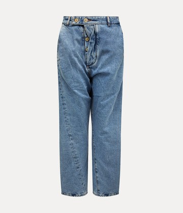The Worlds End Drunken trousers, in a light denim wash, feature the house's signature drunken system, which draws from traditional British tailoring with a twisted, skewed approach to cutting. The trousers are defined by an asymmetric front closure, creating a distorted, draped effect that embodies the house's punk aesthetic.