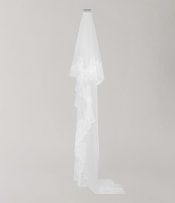 Our Lace Edge Chapel veil is crafted from sheer lace fabric and delicately embroidered with an intricate floral motif along the edges. Designed in a tiered silhouette, it features a flowing train that cascades elegantly to the floor. The silver-tone plated comb is gentle on the hair and flexible, allowing for easy adjustment to complement the bride's hairstyle.