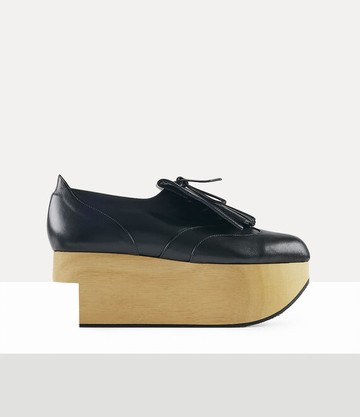 The Rocking Horse Golf shoes take inspiration from classic British golfing footwear, featuring intricate decorative topstitching and a distinctive leather fringe detail that elegantly conceals the laces. The design is elevated by contrasting wooden platform soles, characterised by a curved front and signature cut-out detail - elements first introduced in the Autumn-Winter 1987-88 'Harris Tweed' collection.