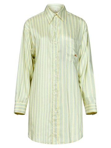 Front buttons closure Pointed collar; Long sleeves, dropped shoulders, one-button cuffs Chest patch pocket with embroidered E logo and Pegaso Back yoke with pleats Curved hem All-over vertical striped pattern Thigh length Comfort fit Yellow color 86% Viscose, 14% Silk Made in Italy Item in photo corresponds to a S. Mannequin size: 42 IT. Mannequin measures: Height 1.75cm, Bust/Breast 85cm, Waist 65 cm, Shoulder 404 cm, Neck 36 cm, Arm lenght 57cm, Wrist circumference 16cm, Breast level 26cm, Knee level 66cm