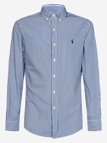Front buttons closure Button-down collar; Long sleeves, one-button cuffs Blue Pony embroidery at chest All-over vertical striped pattern Curved hem Slim fit Color: blue/white 91% Cotton, 9% Elastane Made in Cambodia Item in photo corresponds to a M. Mannequin size: 48 IT. Mannequin measures: Height 1.85 cm, Bust/Breast 94cm, Waist 75cm, Shoulder 44cm, Neck 43cm, Hip Bone 93cm, Arm lenght 62cm, Breast level 26cm, Knee level 63cm, Wrist circumference 20cm