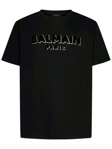Ribbed crewneck; Short sleeves Black and gold flocked Balmain logo at chest Straight hem Casual fit Black color 100% Cotton Made in Portugal Item in photo corresponds to a M. Mannequin size: 48 IT. Mannequin measures: Height 1.85 cm, Bust/Breast 94cm, Waist 75cm, Shoulder 44cm, Neck 43cm, Hip Bone 93cm, Arm lenght 62cm, Breast level 26cm, Knee level 63cm, Wrist circumference 20cm