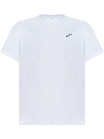 Ribbed crewneck; Short sleeves Diagonal black Coperni logo at front Straight hem Boxy fit Optical white color 100% Cotton Made in Portugal Item in photo corresponds to a M. Mannequin size: 48 IT. Mannequin measures: Height 1.85 cm, Bust/Breast 94cm, Waist 75cm, Shoulder 44cm, Neck 43cm, Hip Bone 93cm, Arm lenght 62cm, Breast level 26cm, Knee level 63cm, Wrist circumference 20cm